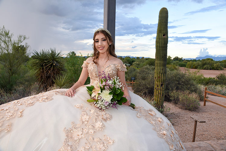 Quinceañera con vestido beige y flores, posando frente a cactus en zona desértica de Pinetop.