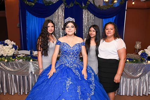 Fotografía de quinceañera en salón con decoración azul, acompañada por sus seres queridos.